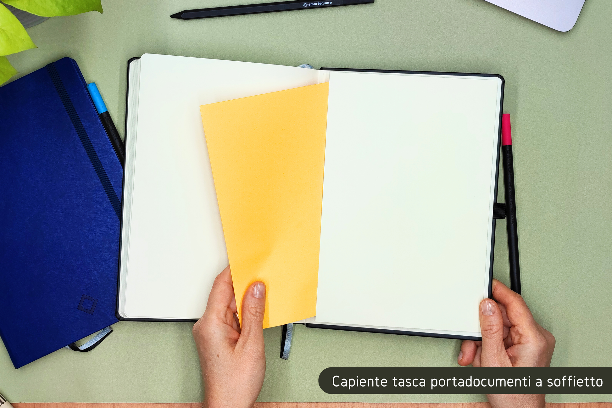 La copertina rigida con angoli arrotondati è realizzata artigianalmente, con un rivestimento in similpelle vegan cruelty free elegante, professionale e resistente. E' completa di elastico chiusura spesso 8mm e portapenna, doppio segnalibro e capiente tasca a soffietto per i documenti che vorrai portare sempre con te!