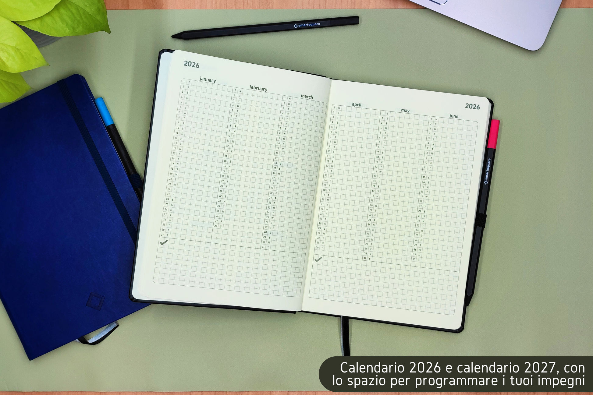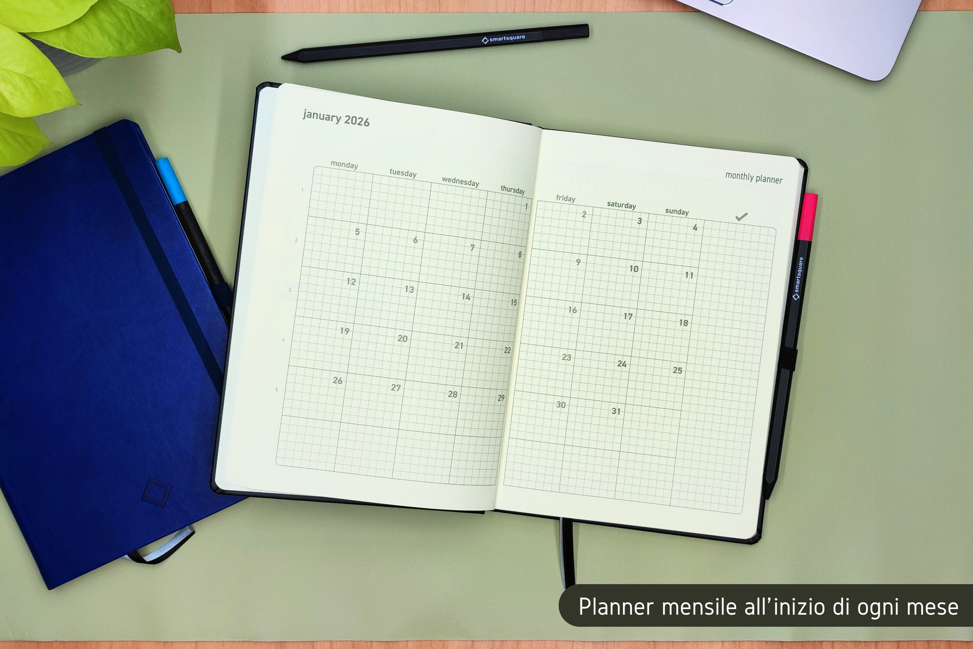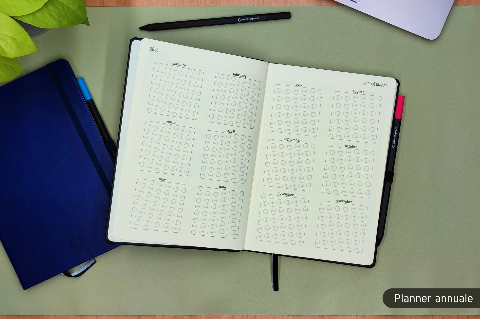 Smartsquare® è stata studiata per aiutarti a gestire il tuo tempo. Oltre al pratico Weekly planner, troverai l'Annual planner per una visione a lungo termine e il Monthly planner all'inizio di ogni mese. Infine un pratico calendario 2027 ti permetterà di annotare anche gli impegni più lontani!